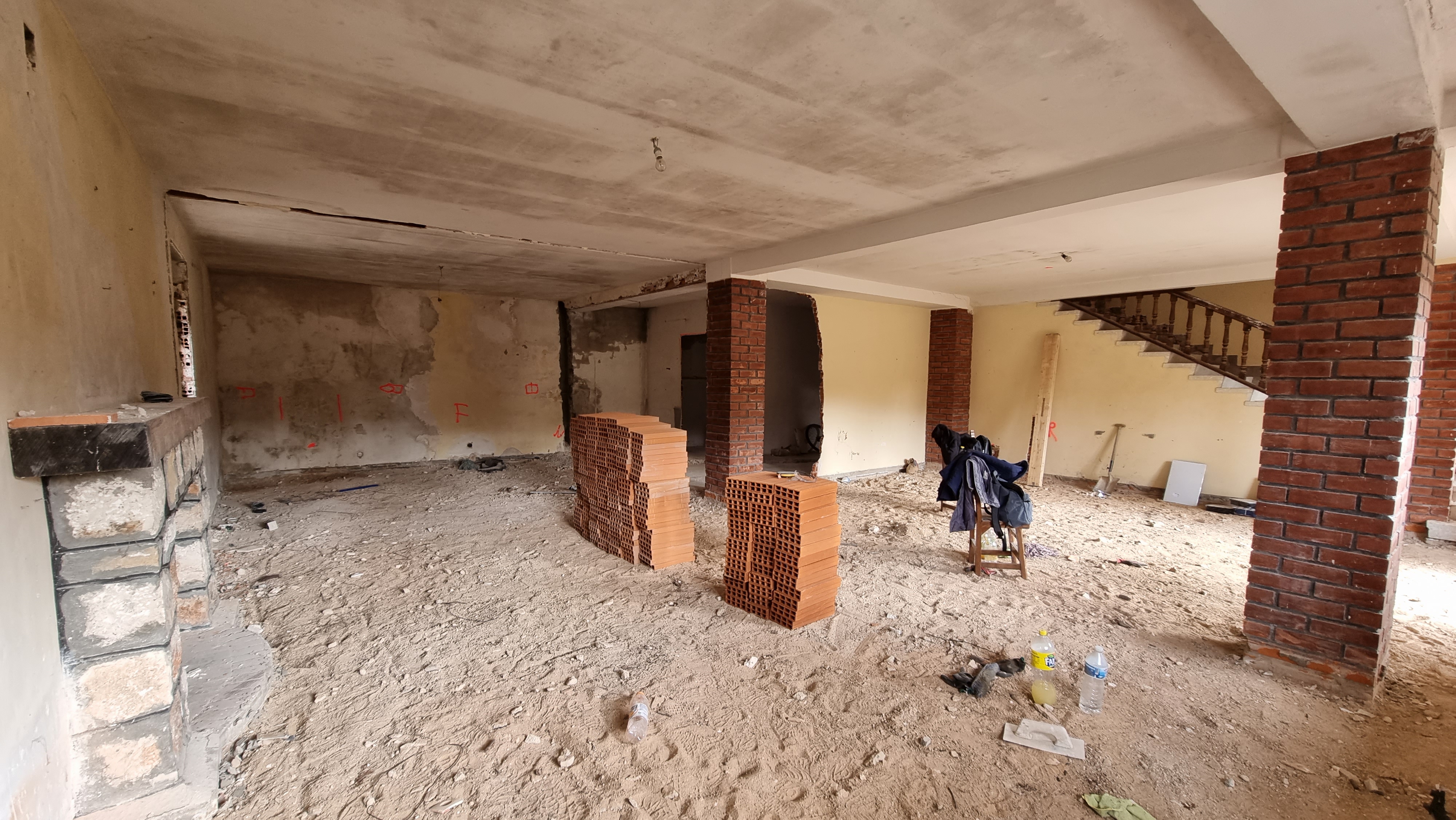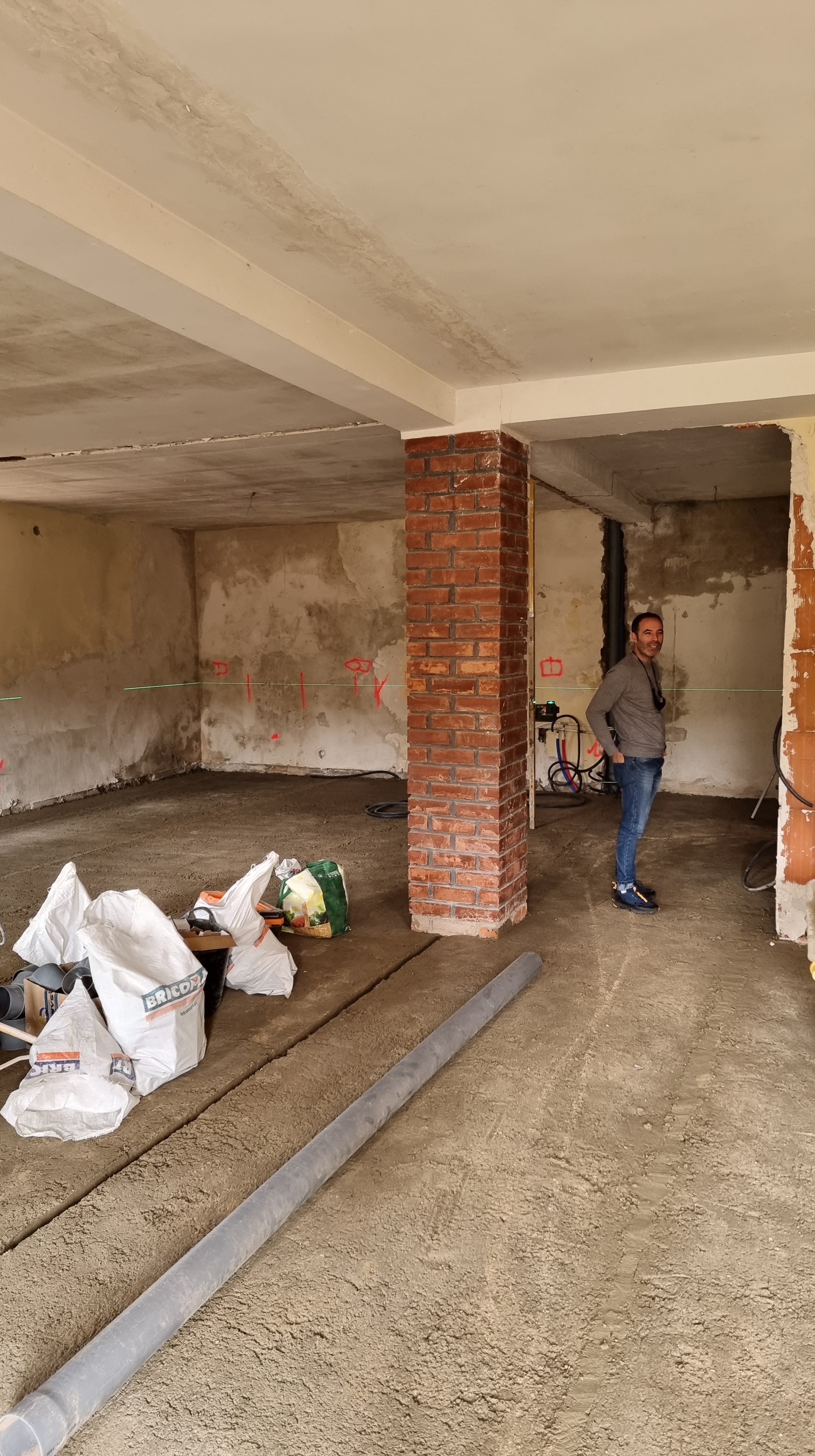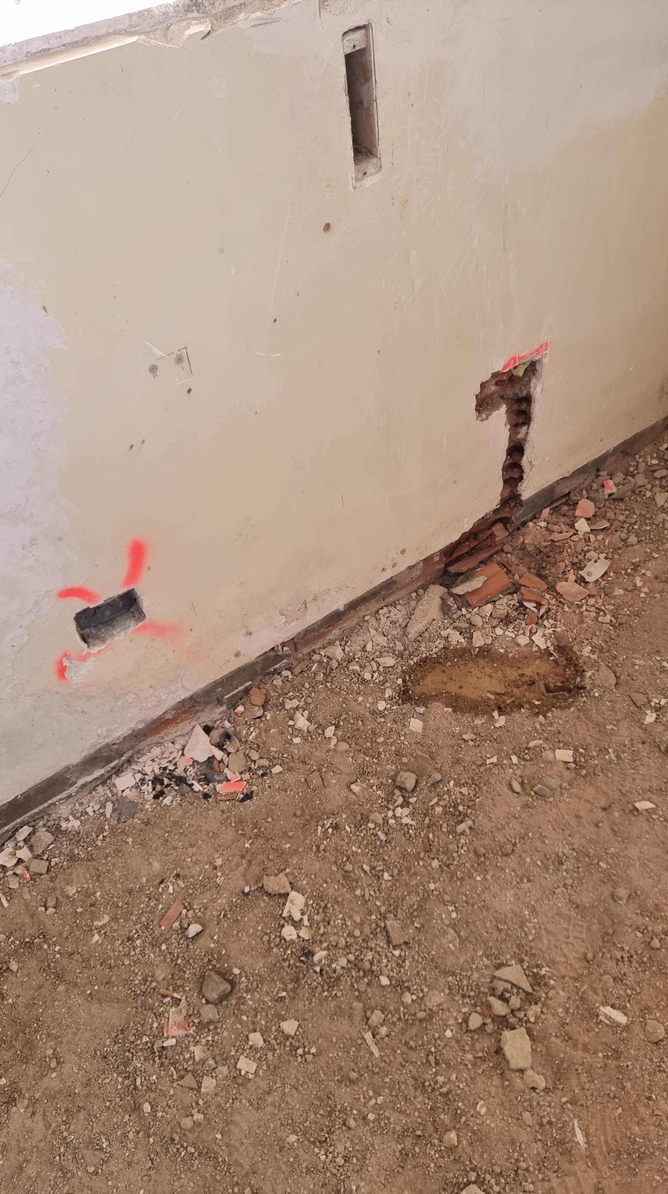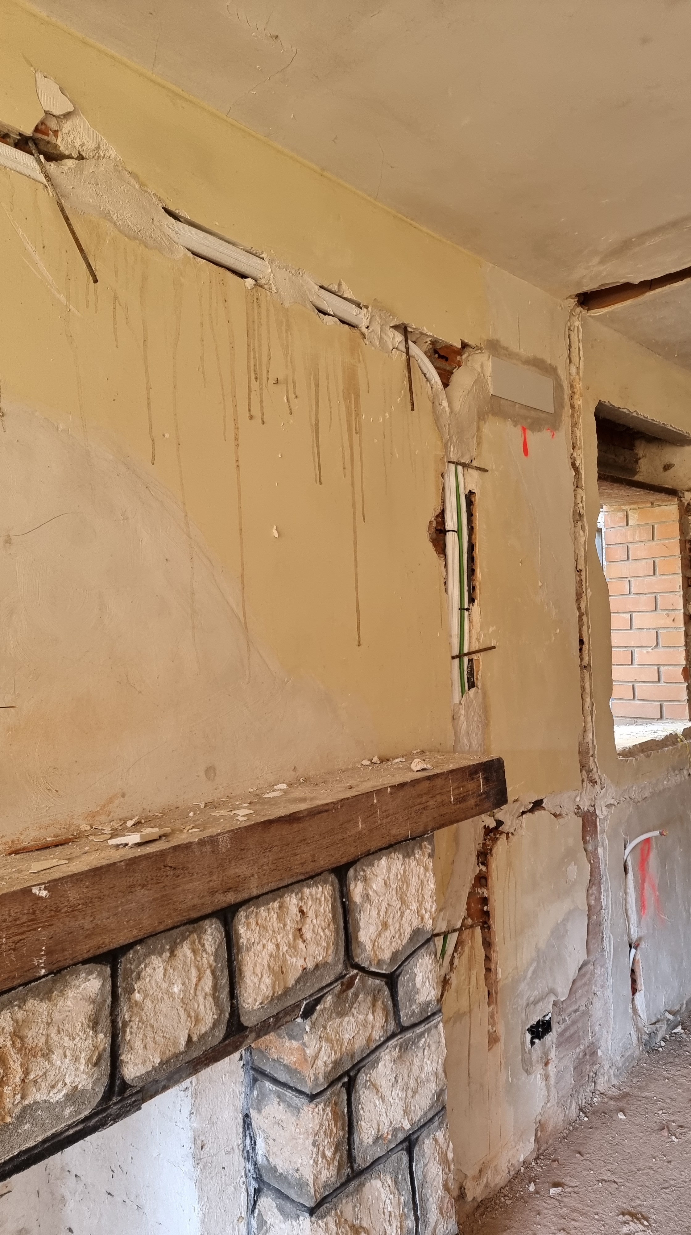 I look at the video. It was the back wall of the ground floor. The work had recently started and everything was broken and dusty. Everything looked fine, but it only took a couple of seconds to see an unusual movement on the wall. It was a waterfall, rushing down from the upper floor to the lower floor.